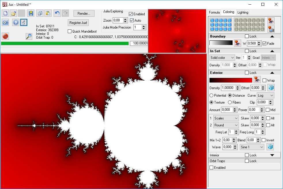 Jux is a fractal explorer for 2D Julia and Mandelbrot sets. It includes a variety of formulas. It has beautiful coloring and lighting effects. It is easy to use. There is no formula editor or scripting.