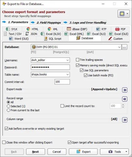 - file formats like text, CSV, JSON, XLS, XLSX, RTF, XML, HTML, PDF, DBF, SLK, SQL script (with INSERT, UPDATE, MERGE, or DELETE statements);