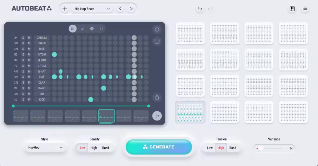 AutoBeat is a novel 12-track MIDI beat generator plugin that leverages the power of AI to generate unlimited beats in various styles. From hip-hop to techno, AutoBeat never runs out of ideas. The workflow is simple: choose your parameters, click on the generate button, edit, share or clear and start again.