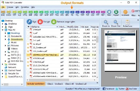 Total PDF Converter Software changes PDF files to DOC, RTF, TIFF, XLS, HTML, EPS, PS, TXT, CSV, PDF/A and images in batch. Unlike other batch PDF converters, the Total PDF Converter is extremely user-friendly thanks to a well-planned interface.