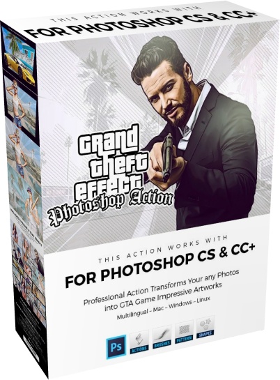 Grand Theft Effect - потрясающий экшен фотошоп превратит вашы обычные фотографии в стилизованные картинки в стиле GTA. Не тратьте много времени, пытаясь создать этот эффект вручную, сделайте это за считанные секунды всего одним кликом. Создание этого эффекта никогда не было таким простым и увлекательным, оставляя вам многоуровневые и настраиваемые результаты. Действие также создает 10 предустановленных цветов, которые вы можете выбрать.