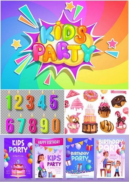 Happy birthday greeting card with balloon, flags, confetti (EPS) |