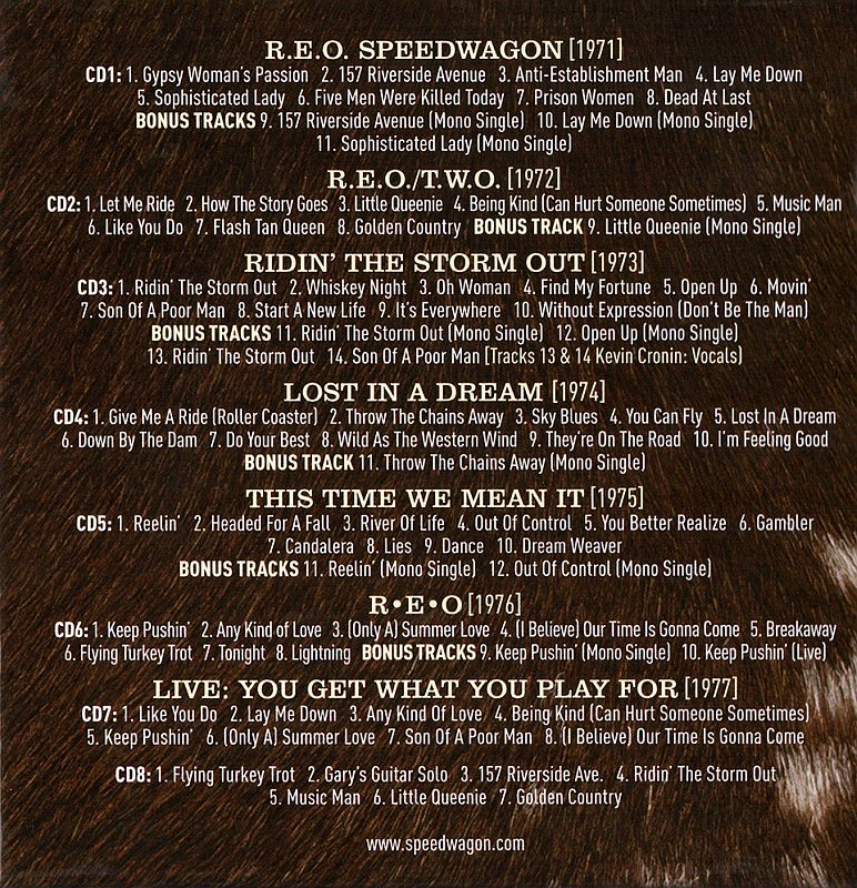 В данный бокс-сэт вошли первые шесть студийных альбомов и двойной концертник R.E.O. Speedwagon. Если вы хотите послушать хард-роковый период этой американской команды, то эта коллекция для вас.