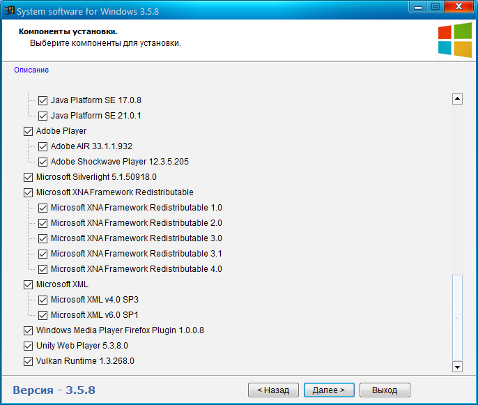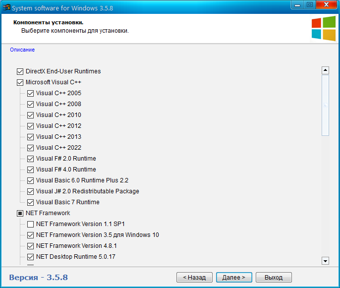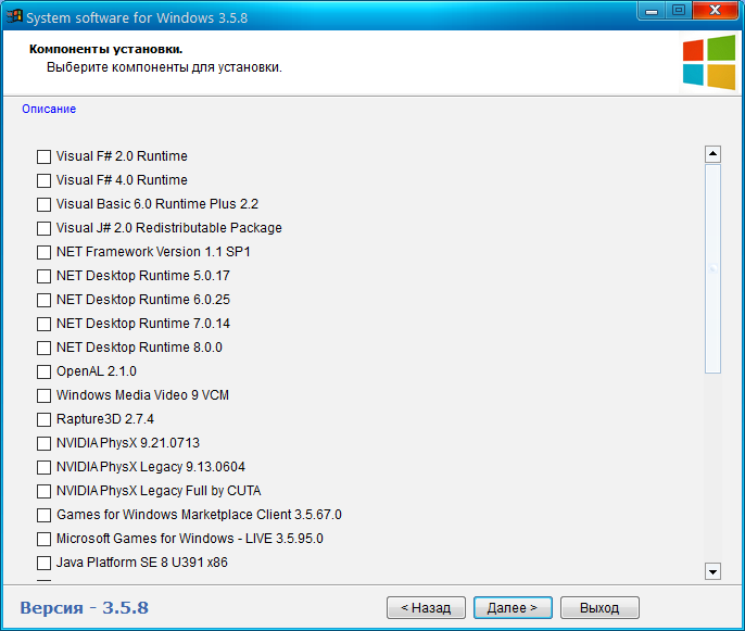 Состав набора: -DirectX (DC 18.02.2021) -Microsoft Visual С++ (2005-2008-2010-2012-2013-2019-2022 x86 и x64 + Visual Studio 2010 F# Runtime 2.0 + F# Runtime 4.0 + Visual Basic 6.0 Runtime Plus 2.2 + Visual J# 2.0 Redistributable Package + Visual Basic 7 Runtime) -NET Framework Version 1.0 SP2 для Windows XP -NET Framework Version 1.1 SP1 -NET Framework Version 3.5 SP1 -NET Framework Version 3.5 для Windows 8 - 10 - 11 -NET Framework Version 4.0 -NET Framework Version 4.6 -NET Framework Version 4.8 -NET Framework Version 4.8.1 -NET Desktop Runtime 5.0.17 -NET Desktop Runtime 6.0.25 -NET Desktop Runtime 7.0.14 -NET Desktop Runtime 8.0.0 -Windows Media Video 9 VCM -OpenAL 2.1.0 -Rapture3D 2.7.4 -NVIDIA PhysX 9.21.0713 -NVIDIA PhysX старая версия 9.13.1220 -NVIDIA PhysX Legacy 9.13.0604 -NVIDIA PhysX Legacy Full by CUTA -RuntimePack Lite 20.3.3 -Games for Windows — LIVE 3.5.95.0 Final -Java Platform SE 8 U391 -Java Platform SE 11.0.19 -Java Platform SE 17.0.8 -Java Platform SE 21.0.1 -Adobe Shockwave Player 12.3.5.205 (Repack by CUTA) -Adobe AIR 50.2.1.1 -Microsoft Silverlight 5.1.50918.0 -Microsoft XNA Framework Redistributable (1.0, 2.0, 3.0, 3.1, 4.0) -Microsoft XML v4.0 SP3 -Microsoft XML v6.0 SP1 -Windows Media Player Firefox Plugin 1.0.0.8 -Unity Web Player 5.3.8.0 -Vulkan Runtime 1.3.268.0 Описание компонентов: DirectX - Исполняемая библиотека для конечного пользователя обновит текущую версию DirectX – встроенную технологию Windows®, которая позволяет запускать высокоскоростное мультимедиа и игры на компьютере. Microsoft Visual С++ - Распространяемые пакеты Visual C++ устанавливают компоненты среды выполнения, необходимые для выполнения приложений C++, которые разработаны с помощью Visual Studio С++. NET Framework Version - Распространяемый пакет Microsoft NET Framework устанавливает среду выполнения NET Framework и связанные файлы, необходимые для выполнения и разработки приложений, предназначенных для NET Framework. NET Core Runtime - Позволяет создавать приложения на языках C#, F# и Visual Basic с помощью интеграции в Visual Studio, Visual Studio Code, Sublime Text или Vim. Поддержка спецификации .NET Standard делает .NET Core совместимым с .NET Framework и API-интерфейсами Mono. Windows Media Video 9 VCM — Это видео Compression Manager (VCM) на основе версии Windows Media Video 9 кодерадекодера позволит кодирования и редактирования наследие приложений для поддержки Windows Media Video 9 кодек в контейнерах файлов, таких как AVI. OpenAL - ранее свободно распространявшийся кроссплатформенный интерфейс программирования приложений (API) для работы с аудиоданными. Ключевой особенностью является работа со звуком в 3D пространстве и использование эффектов EAX. Поддерживается компанией Creative. Rapture3D - программа для воссоздания ощущения присутствия путём замены обычных Software-драйверов на их улучшенный вариант. С её помощью в играх можно легко определить, например где находится враг по шагам или где произошёл взрыв и т. п. NVIDIA PhysX - кроссплатформенный физический движок для симуляции ряда физических явлений. Первоначально разрабатывался компанией Ageia для своего физического процессора PhysX. После того, как Ageia была приобретена nVidia, движок перешёл в собственность компании nVidia, которая продолжает его дальнейшую разработку. nVidia адаптировала движок для ускорения физических расчётов на своих графических чипах с архитектурой CUDA. PhysX может также производить вычисления с использованием обычного процессора. NVIDIA PhysX Legacy - необходимо установить для игр, выпущенных в конце 2007 года или ранее. Если игра, выпущенная в этот период, корректно работала с ПО PhysX версии 9.12.0613, но не работает с более поздними версиями, необходимо установить PhysX Legacy. RuntimePack Lite - Предлагаемый набор файлов позволяет избежать *Runtime Error* если не всех, то большинство таких сообщений и подходит (рекомендован к установке) для операционных систем от Windows XP до Windows 10 (x86/x64). Games for Windows - LIVE - бесплатный игровой онлайн-сервис для Windows, как и Xbox Live, ориентированный на сетевую игру. Он позволяет пользователям ПК соединять