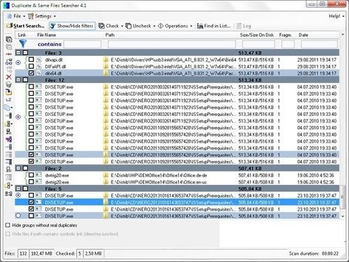 Duplicate & Same Files Searcher (Duplicate Searcher) is an application for searching duplicate files (clones) and NTFS hard links to the same file. It searches duplicate file contents regardless of file name (true byte-to-byte comparison is used). This application allows not only to delete duplicate files or to move them to another location, but to replace duplicates with NTFS hard links as well (unique!).