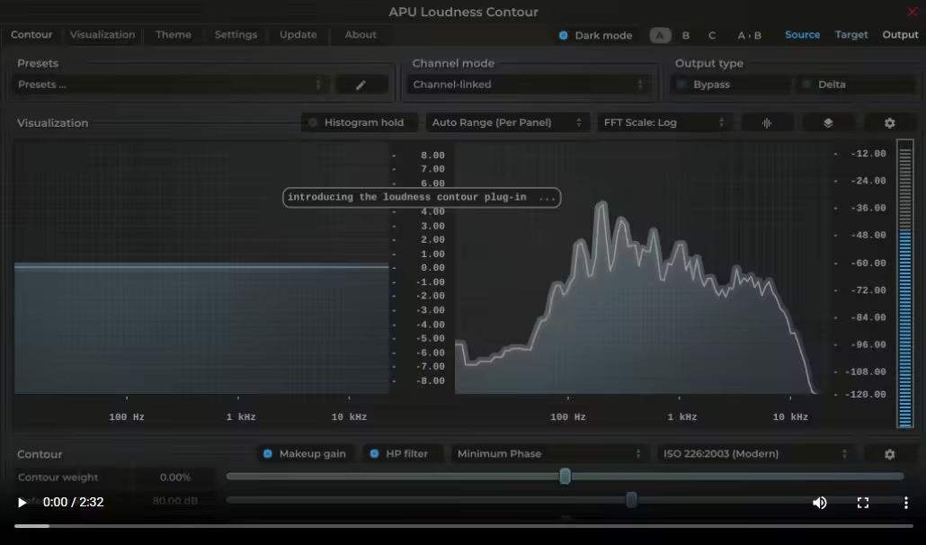 APU Loudness Contour is a real-time equal-loudness filter that offers precise control over a wide range of perceptual loudness contours, including ISO 226 (2003 & 2023), Fletcher-Munson, K-weighting, A/C-weighting, ECMA-418, and ITU-R 468.