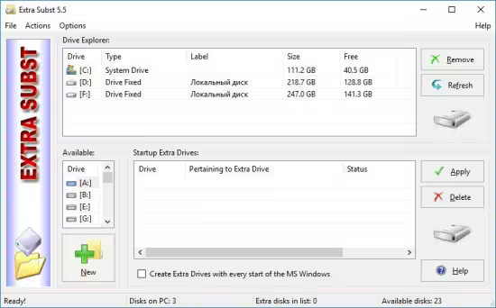 Extra Subst - program designed to make access to frequently used folders of your computer easier. It is also used to create, edit and remove virtual drives of your computer. Extra Subst creates virtual drives on the basis of selected folders. Physical drives remain unchanged and are not divided into additional partitions.