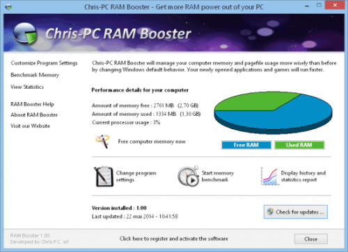 Chris-PC RAM Booster will definitely improve things! Your computer will get a boost, since RAM Booster will monitor the RAM (Random Access Memory) usage and when that gets to a certain low memory threshold, it will trigger the process of freeing up memory for newly opened programs while at the same time move the old programs from the RAM memory to the virtual memory on the disk.