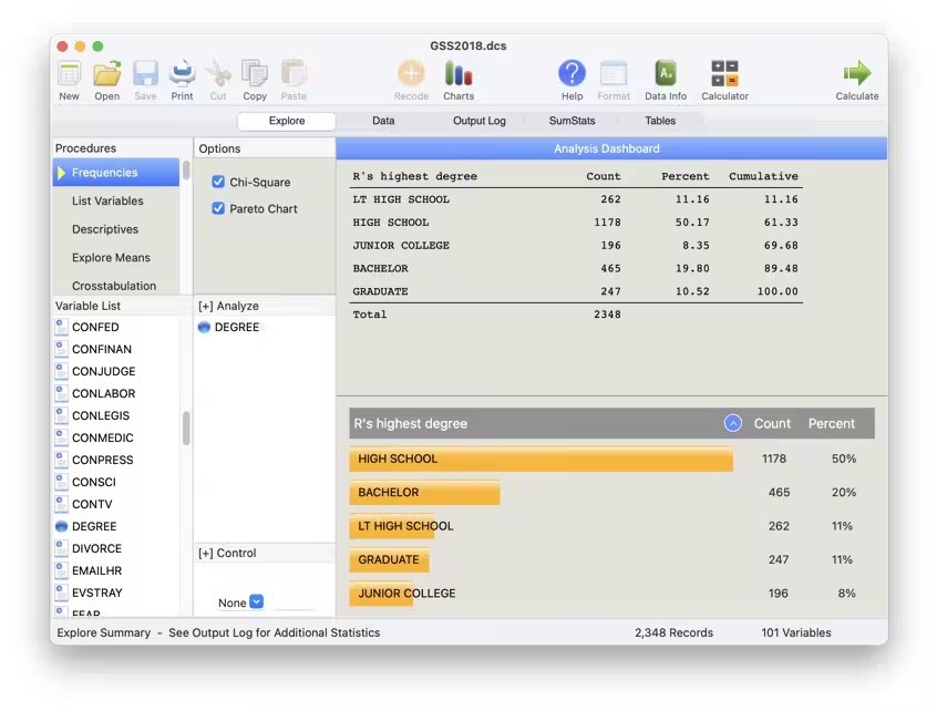 Analyze data using common statistical procedures. Enter data into the data tab, import and export delimited files, copy and paste or drag and drop data directly from a spreadsheet. AcaStat produces frequencies tables, crosstabulations, descriptive statistics, correlations, OLS and logistic regression, t-tests, nonparametric tests and more. Format variable and value labels, set missing values, use controls, and recode variables. Includes 31 summary statistic procedures and five help modules.