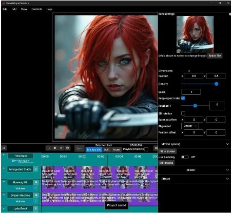 You don't need to be professional video editor to use this app (but you can be :) ). DAW-like horizontally scrolling multi-track timeline, familiar from all digital audio workstations, is used to keep track of you items. Lyric, video, audio, primitive and generative AI tracks, as many as you want and need, keeping mind you PC performance. Includes integrated library for video import & export and also support using FFMPEG optionally. This is the video maker rethought from the scratch!