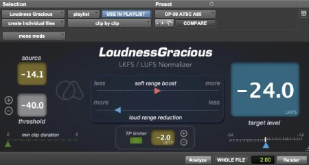 Loudness Gracious unites WaveRider's legendary level riding with Defaulter's loudness detection to deliver smooth, accurate loudness control in an offline workflow. Whether you're mixing for broadcast, film, games, podcast, or music, Loudness Gracious gets you to exact LKFS/LUFS values while gently shaping dynamics with adjustable ratios. The result? Clean, natural sound - fast.