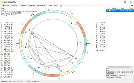 GERMES is designed to perform astrological calculations and express analysis of the results. For professional astrologers, the software provides a flexible and easily customizable tool for solving the most various astrological tasks, such as rectification, long-term and short-term forecasting, analysis of the natal chart.