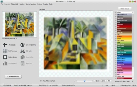Brickaizer remembers your last and favourite settings as projects, so you can resume any time with your brick mosaic. Brick mosaic creation is interactive and very easy to use, and all output is in readable and printable formats, like bitmaps and excel spreadsheet with amount, cost and position/orientation data.