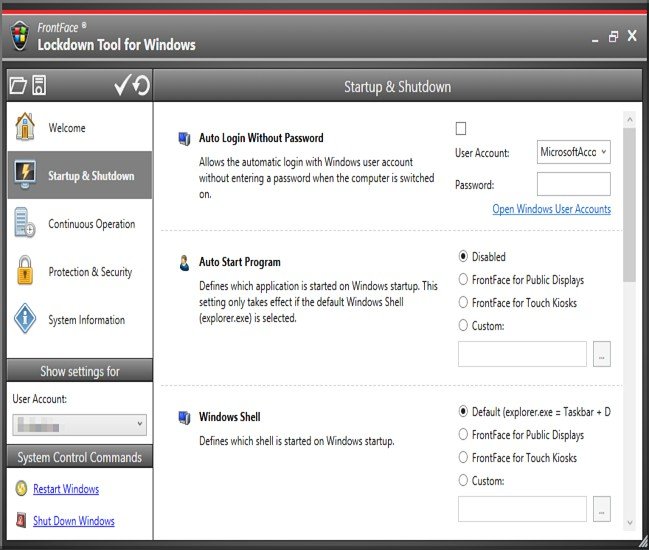 FrontFace Lockdown Tool enables you to protect and lock down any Windows PC for use as public kiosk terminal, digital signage applications or other unattended use.