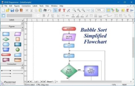 EDGE Diagrammer can create flowcharts and similar diagrams with minimal effort. As you draw your diagram, EDGE Diagrammer connects lines to figures and attaches labels to lines. It remembers these relationships and adjusts automatically when you move objects around. It can also adjust the size of a shape when you add text to it.