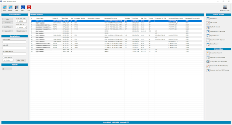 Sante Worklist Server (MWL Server) is an autonomous program that can receive via HL7 communication messages the patients demographics and scheduling information of exams that are stored in a HIS/RIS system (Hospital Information System / Radiology Information System) and transfer them to any modality/medical scanner via DICOM communication protocols (C-FIND). The program offers an automated, error-free and reliable transfer of the information form HL7 nodes (HIS/RIS) to DICOM nodes (medical scanners) without any human reaction.