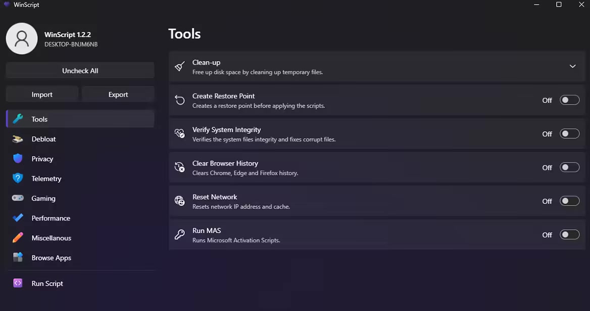 Performance: Set background services to manual to free resources, set your preferred DNS, clean temp files & more.