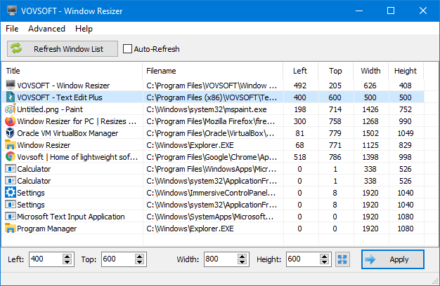 When you open the program, it shows the list of all apps running on your Windows PC. You can select any app and specify the size at the bottom section and click on the "Apply" button.