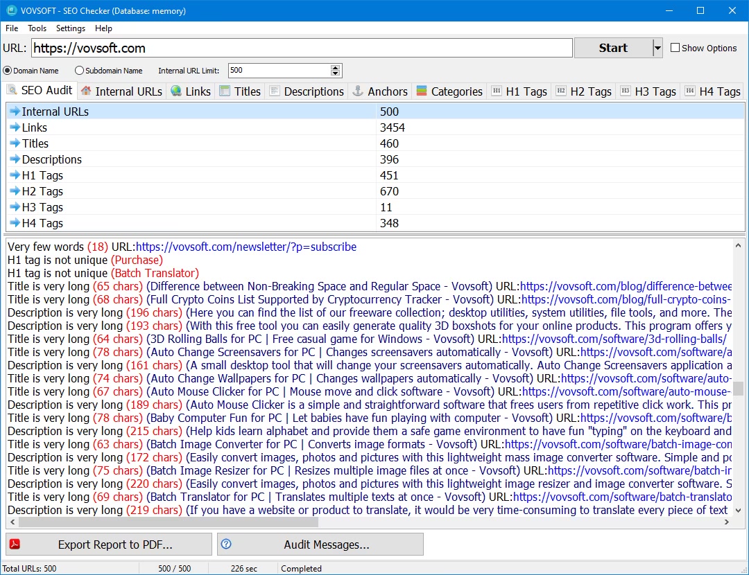 Vovsoft SEO Checker is an easy to use website crawler that can efficiently crawl both small and large websites. With this SEO checker tool, you can identify broken links, analyze on-page SEO data, distinguish between internal and external links, and classify links as dofollow or nofollow. Additionally, the tool provides analysis of internal linking, titles, description meta tags, and other tags in real-time.