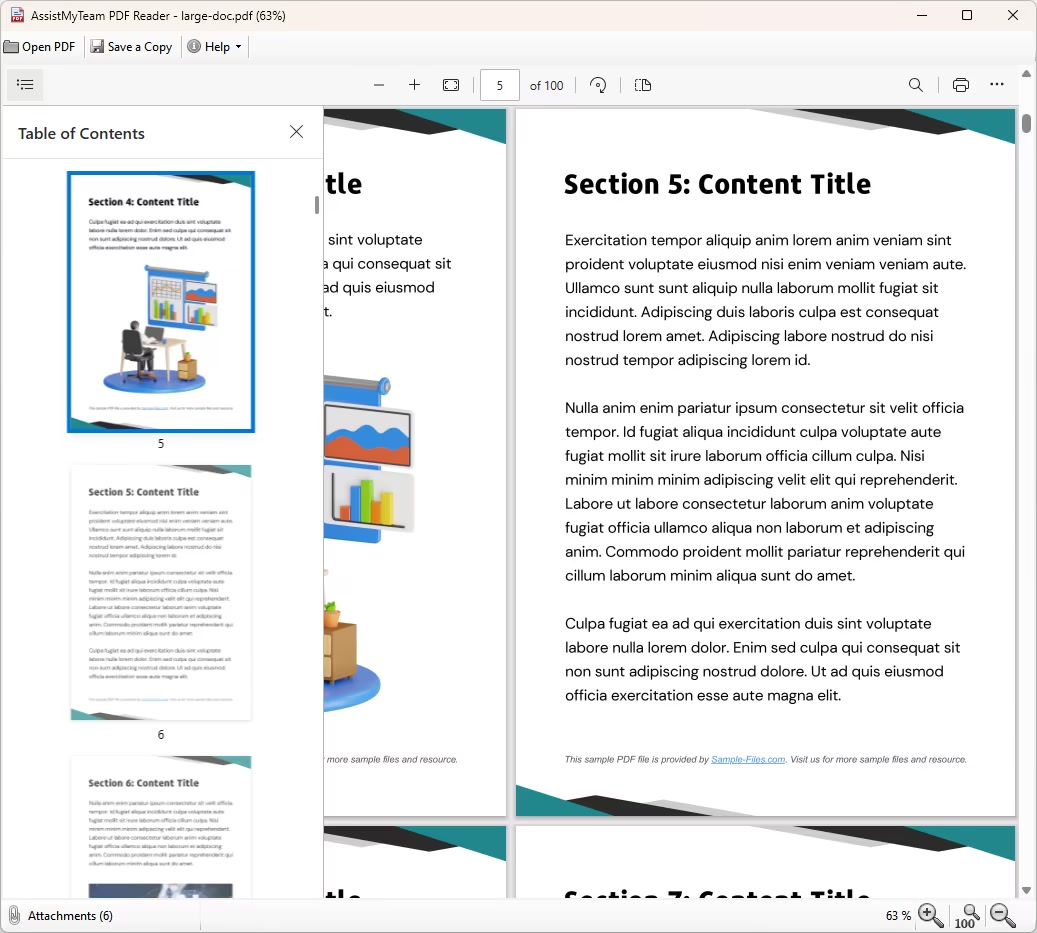 Easy navigation of the PDF pages through bookmarks and thumbnails.