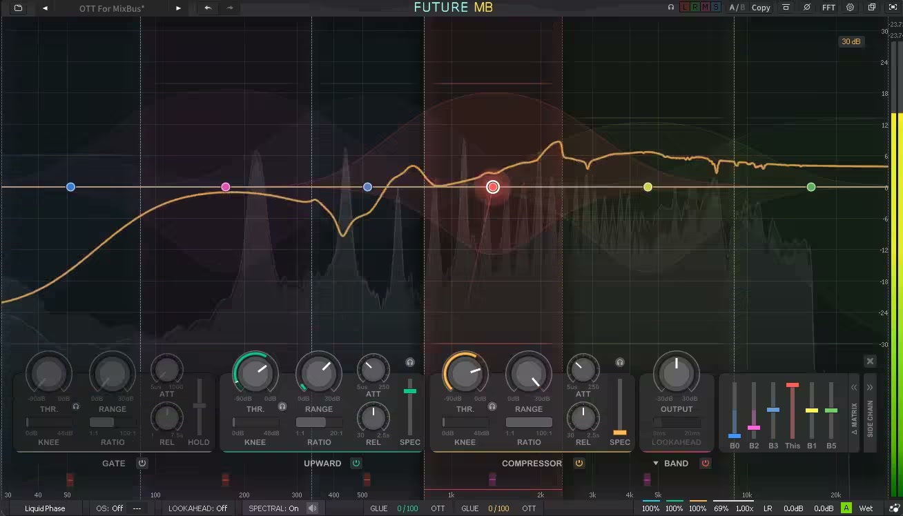 Future MB dissolves the boundary between dynamics and tone. By activating Spectral Mode, you unlock a fluid continuum where Time-Domain and Frequency-Domain processing coexist. Instead of forcing you to choose between standard compression and spectral shaping, Future MB lets you glide effortlessly between them with a single control.