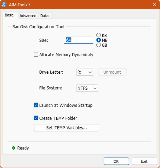 AIM Toolkit is a Windows utility for creating ultra‑fast RAM disks and mounting disk image files (ISO, IMG, BIN, VHD, HDD, etc.) as virtual drives.
