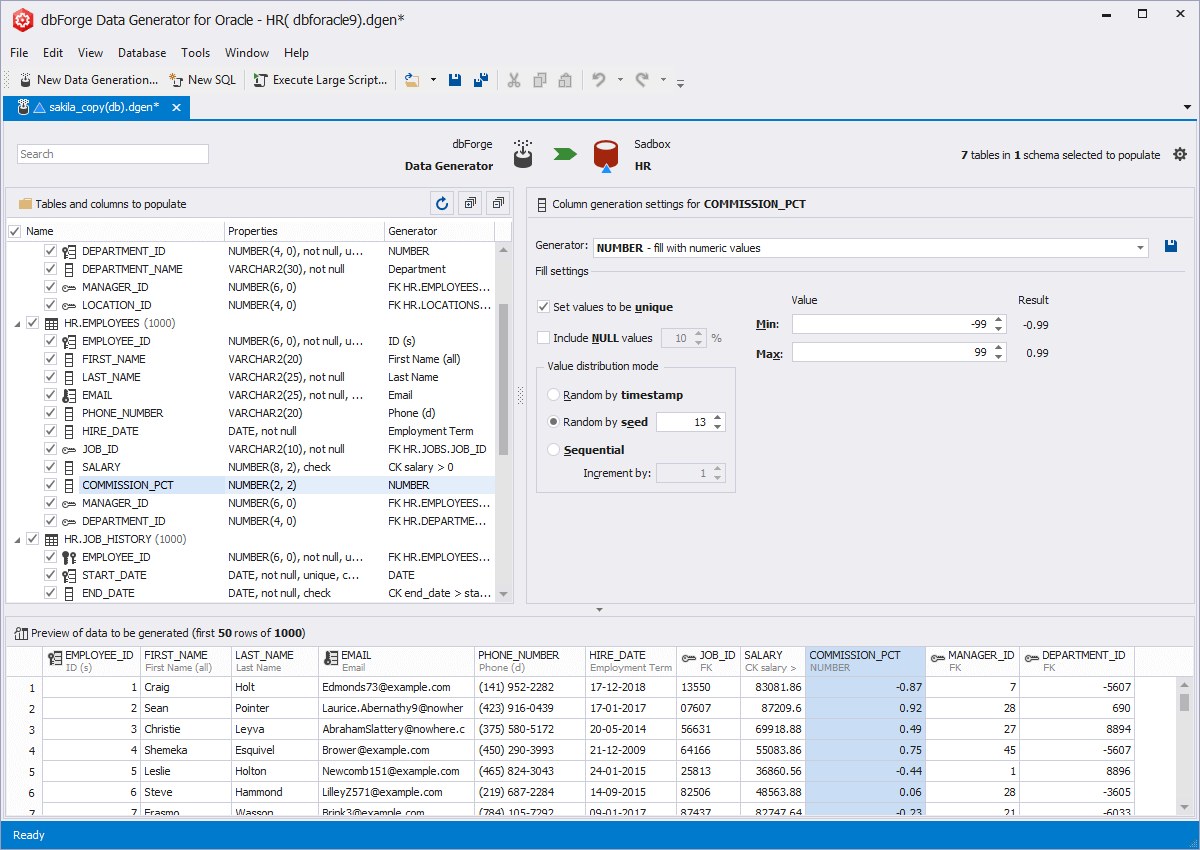 dbForge Data Generator for Oracle is a small but mighty GUI tool for populating Oracle schemas with tons of realistic test data. Having an extensive collection of 200+ predefined and customizable data generators for various data types, the tool delivers flawless and quick data generation (including random number generation) in easy to use interface. Data Generator offers flexible options and templates to create and use your own generators to better suit your requirements.