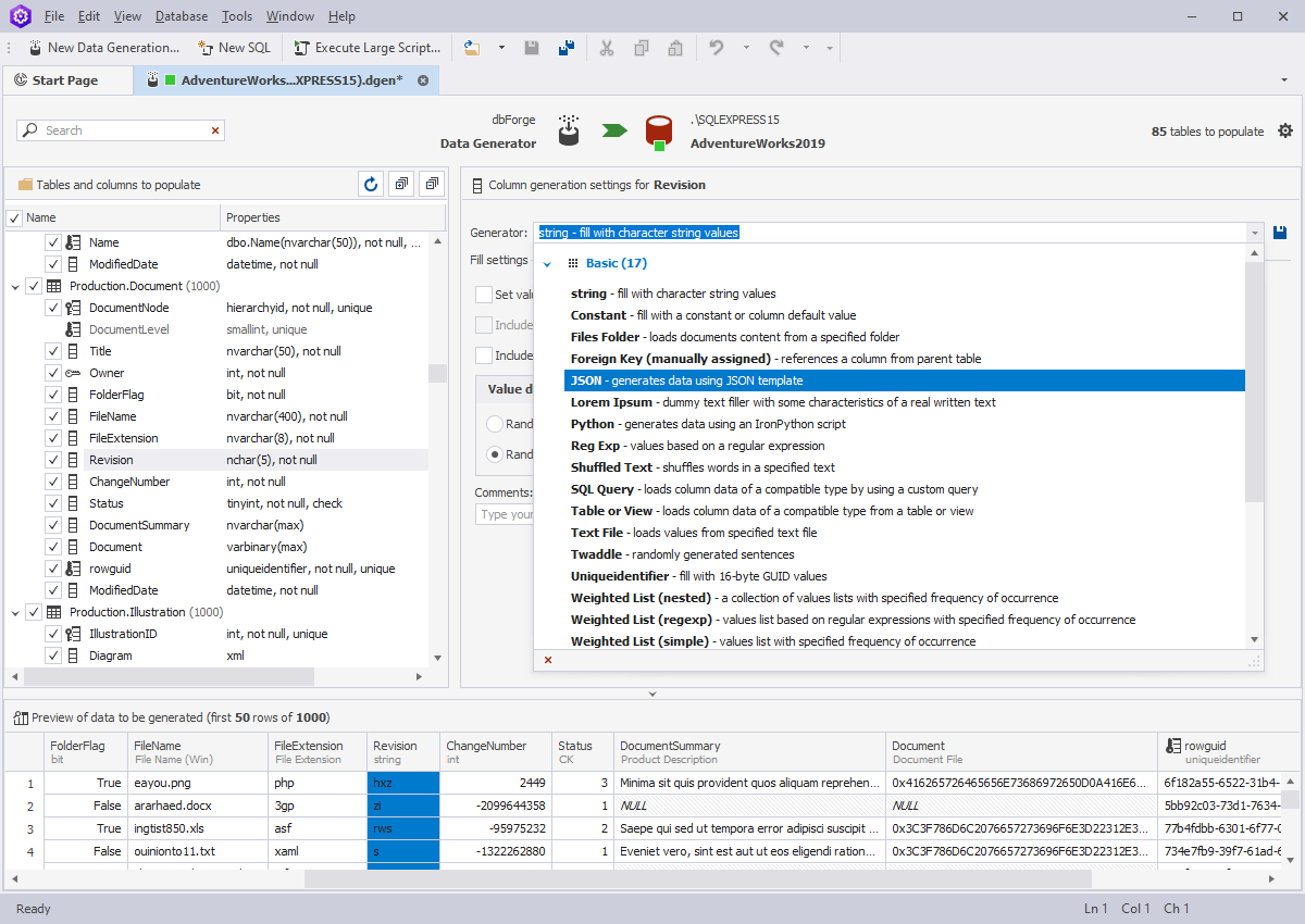 Implement new standards for the population of SQL tables with random data with our visual data generation tool. Data Generator includes 200+ meaningful SQL data generators with sensible configuration options. It provides great flexibility and manual control over the creation of the foreign key data. With the column-intelligent data generation, the data in one column is based on the data of another.