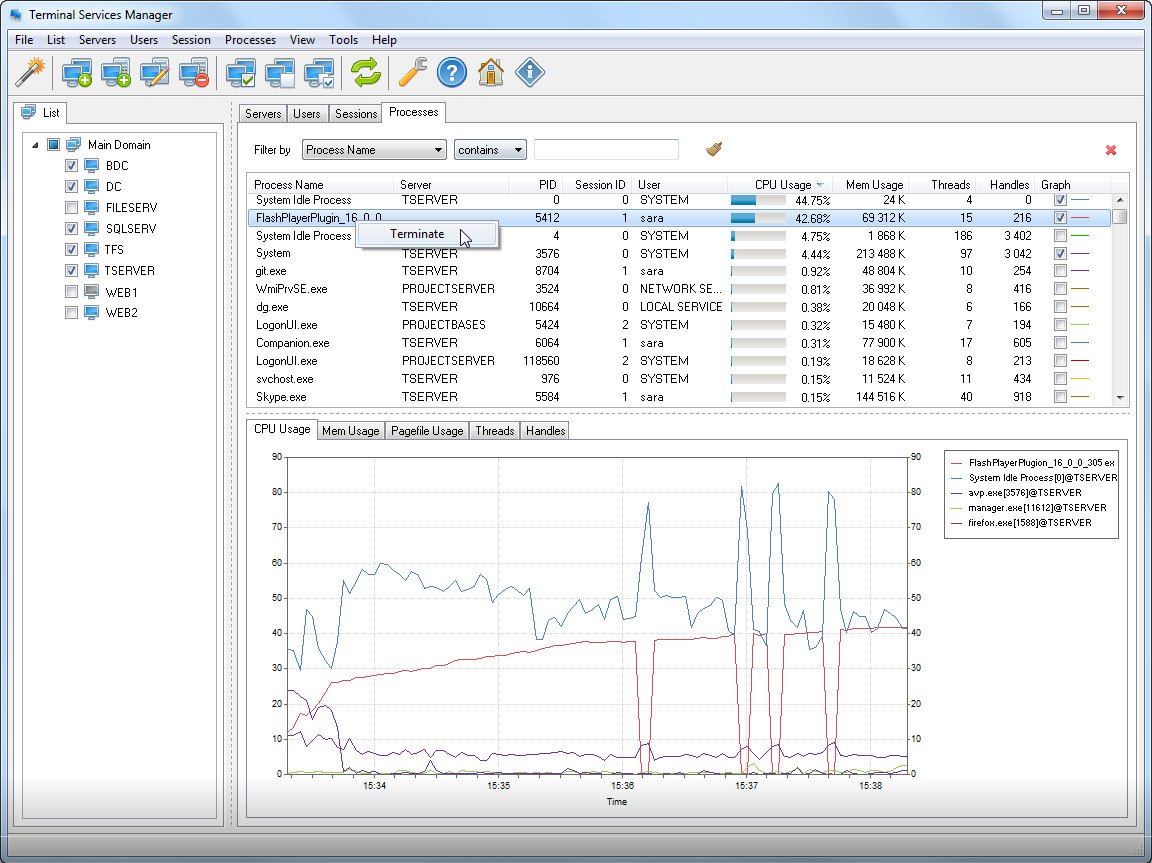 Terminal Services Manager displays information in both table form and by drawing graphs of the usage of CPU, memory, and other resources over time for each server, session, and user.