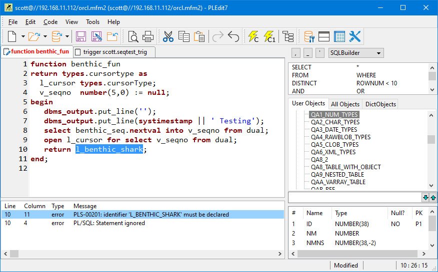 PLEdit allows editing and compiling of PL/SQL code modules (stored procedures.) It is optimized to be quick and resource friendly.