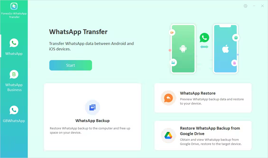 Ultimate WhatsApp Transfer, Backup & Restore Solution. Transfer WhatsApp/WhatsApp Business between Android and iOS devices. Back up WhatsApp to PC/Mac without iCloud or Google Drive. Restore WhatsApp backup from Google Drive to iPhone. Transfer GBWhatsApp to WhatsApp/GBWhatsApp. Good support for the latest iOS 26 and Android 16.
