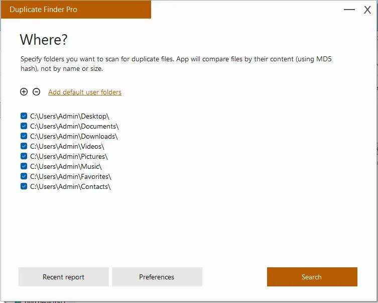 This app does what it named for. You can choose any folder on your hard drive, or use standard user folders and our app will deeply analyze content of selected folder for duplicates. It will take just few seconds. Files will be compared by MD5 hashing algorithm, which mean that they will be compared by content, not by name. Then, using our convenient user interface you can view duplicates and delete those which you don't want.