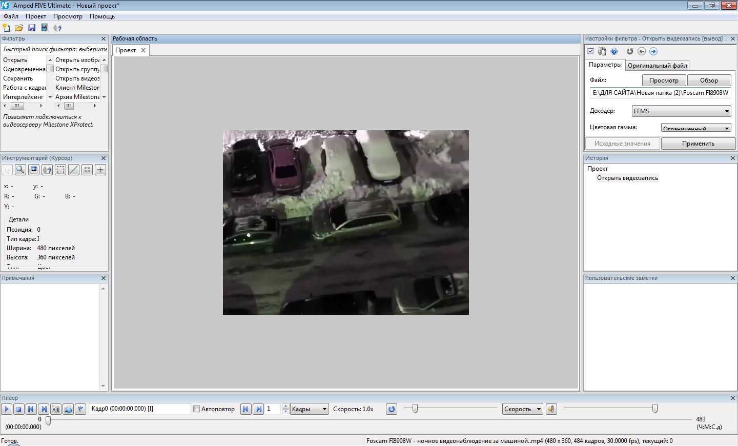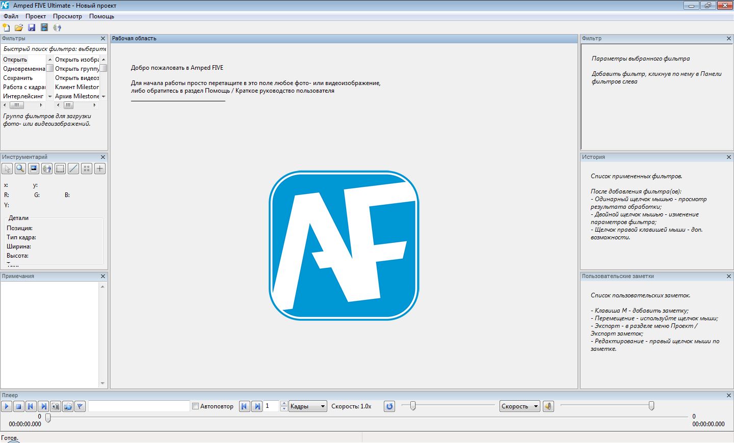Уникальное решение для обработки и анализа цифровых изображений и видеоданных в простой, быстрый и точный способ. Программа не вносит изменений в исходные фото и видеоматериалы. Все операции в Amped Five выполняются путем наложения фильтров, поэтому в исходный материал не вносится никаких изменений и модификаций. Большинство фильтров применяются «на лету», также практически мгновенно можно менять настройки фильтров и порядок их применения в проекте.