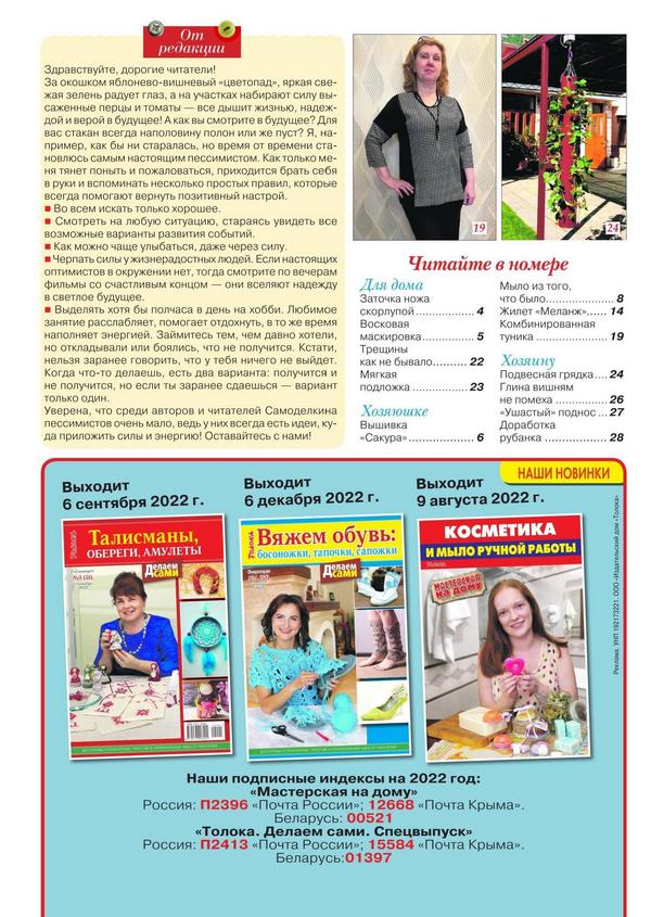 «Делаем сами» — журнал для мастеров и мастериц, находящихся в постоянном поиске свежих творческих идей и решений. Уникальность издания в том, что оно состоит главным образом из писем читателей. В каждом номере: схемы популярных вышивок, идеи для детского творчества, советы по ремонту, оформление дачного участка и дома, секреты рыбалки, новые техники рукоделия, мастер-классы идеи с обложки! Авторы делятся своим опытом, дают полезные практические советы о том, что можно спаять и вырезать, выпилить и выстругать, собрать и склеить, выкроить и сострочить, вышить, связать и сплести СВОИМИ РУКАМИ, чтобы сделать свой дом, дачу, участок красивее и уютнее, а жизнь — комфортнее и интереснее