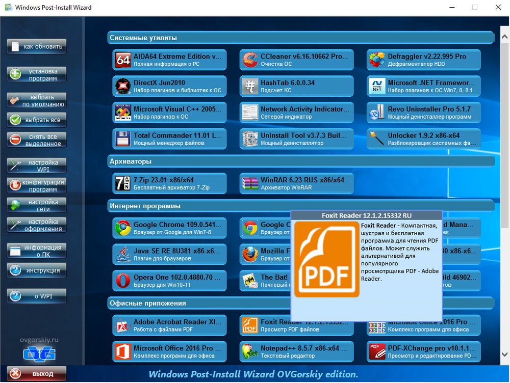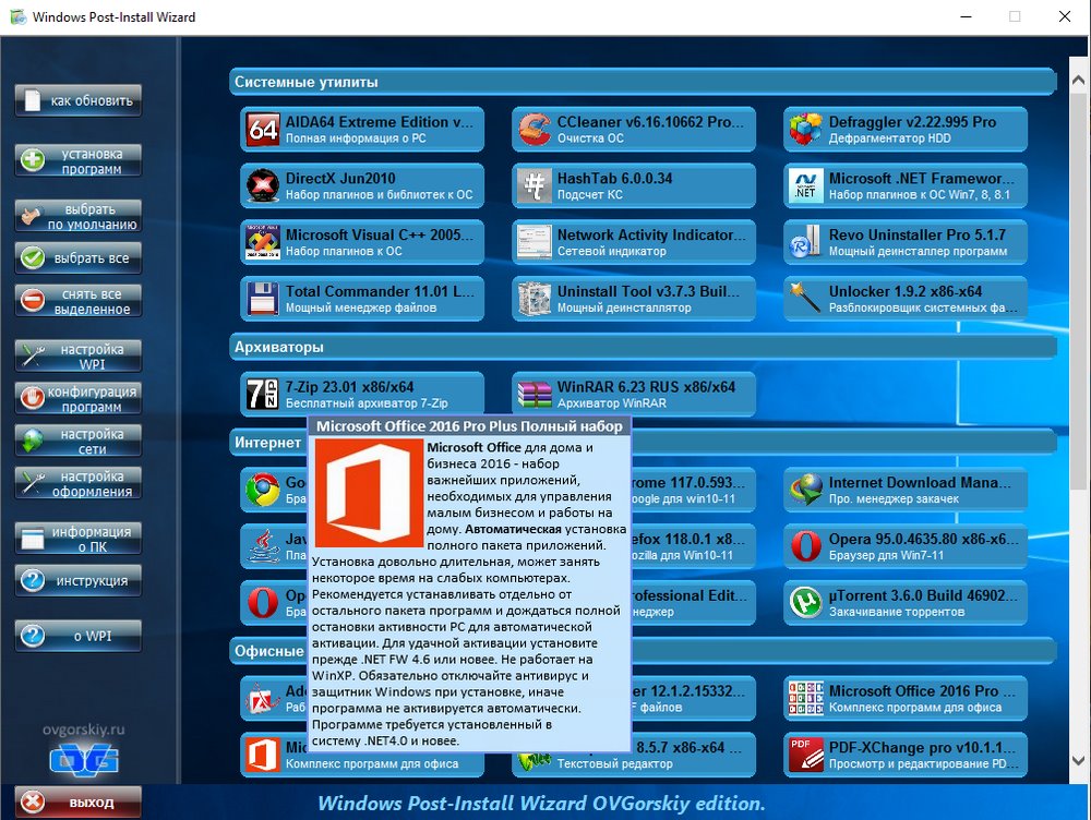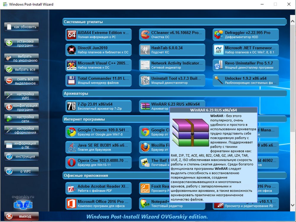 Небольшой пакет программ с "тихой" установкой, помещенных в оболочку установщика программ Windows Post-Install Wizard (WPI). Программы разделены на категории и весь процесс установки и регистрации проходит полностью в автоматическом режиме. Вам стоит только выбрать необходимые программы и запустить установку. Все программы в сборке, имеют краткое описание. Большинство программ автоматически определяют разрядность системы и устанавливаются согласно ей. Все 32-х битные программы полностью совместимы с 64-х разрядной ОС. В сборнике содержится небольшой набор наиболее востребованных и распространённых, на мой взгляд, программ, необходимые большинству пользователей.